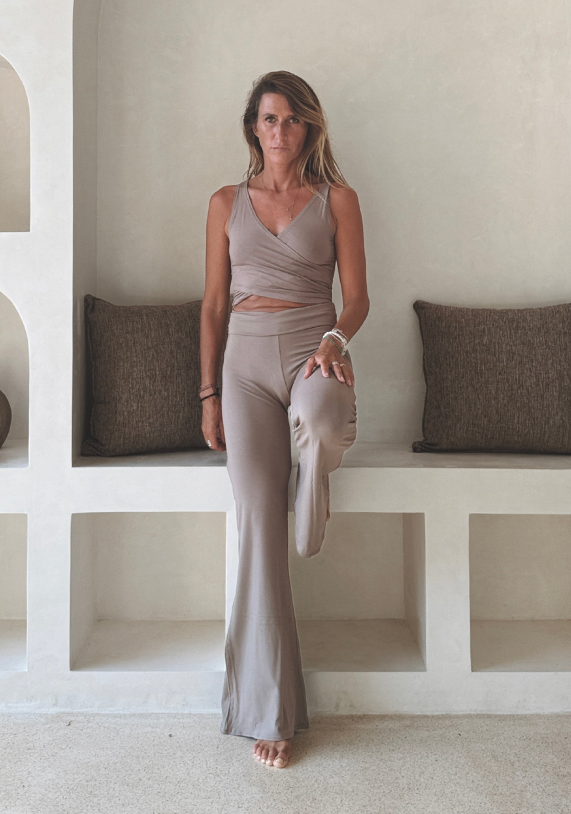 Effortless and sculpting, this two-piece set is crafted from soft plant-based viscose for a smooth, breathable feel. The wrap-style top is fully reversible and can be worn on both sides, offering two looks in one. Finished with high-waisted flared pants that flow naturally with every movement.