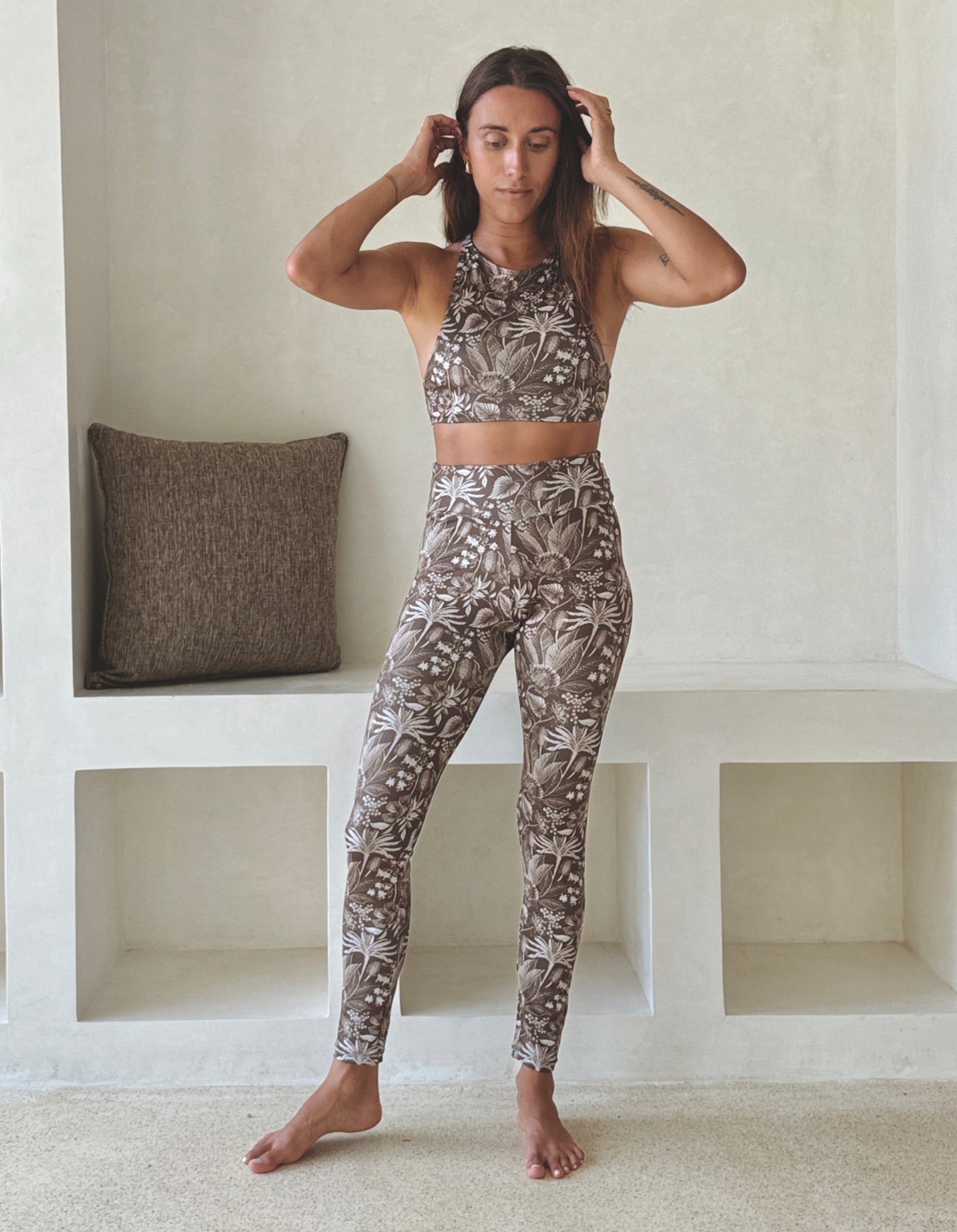 Designed to sculpt and support, this brown tropical yoga set is crafted from recycled, eco-conscious material with a soft, second-skin feel. The supportive top features an elegant open back with delicate string detailing, offering breathability and freedom of movement.